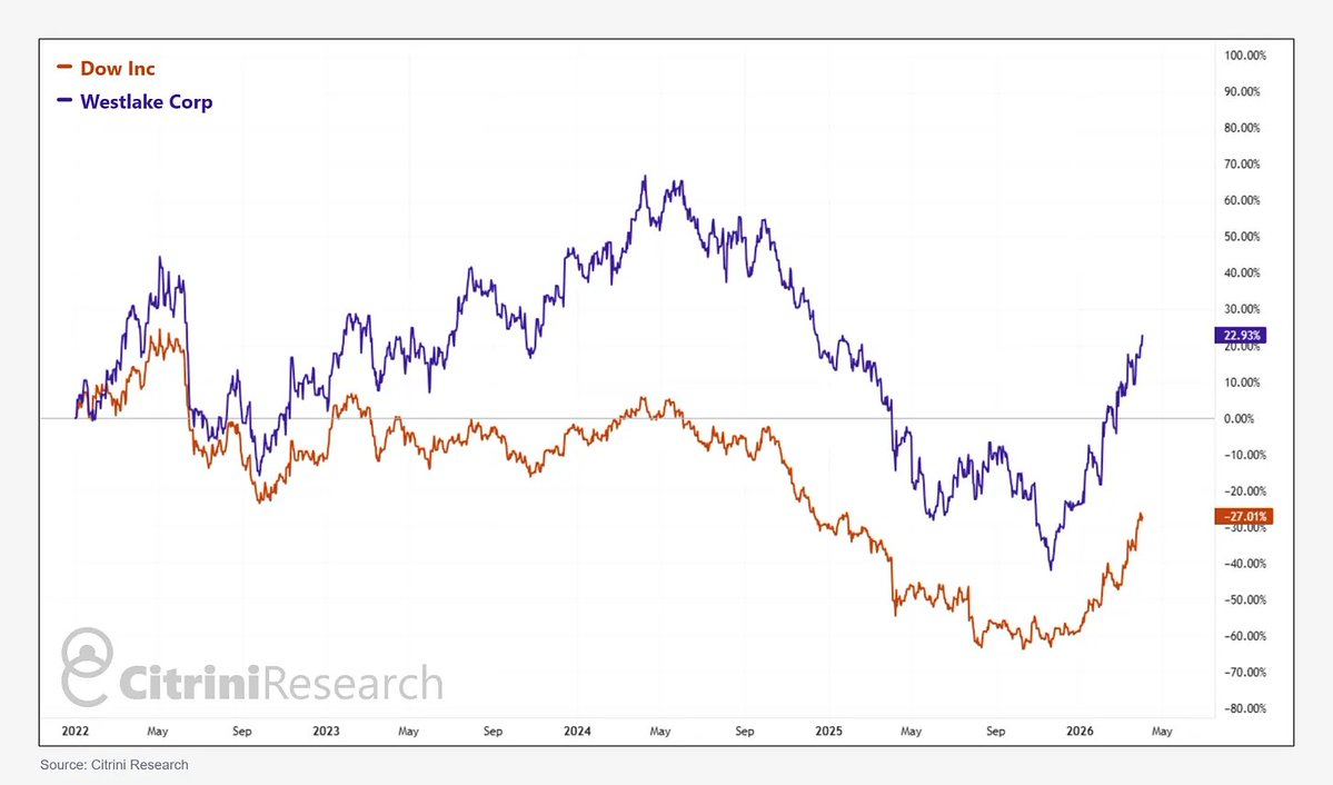 产能破坏是真实的,重建时间线以年而非季度来衡量。我们选择处于这一趋势正确一侧的美国生产商:**陶氏(DOW US)和威斯特莱克(WLK US)**是主要头寸。