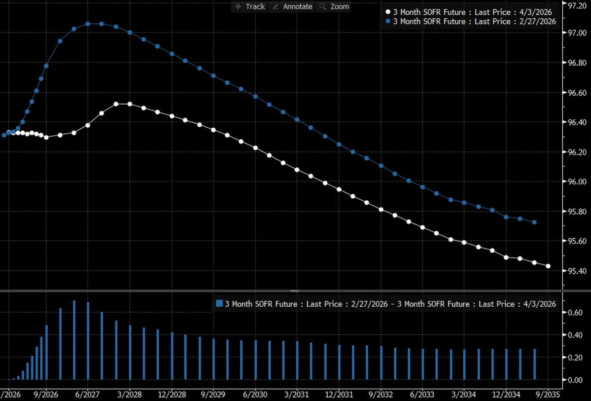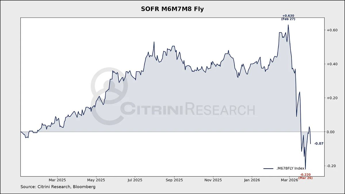 在冲突爆发之前,SFRM6-SFRM7-SFRM8 蝶式交易已经定价了 M6 到 M7 之间比 M7 到 M8 之间多出近 3 次降息——现在是 0。押注降息再次被提前似乎是不对称的,因为对海峡关闭导致全球通胀的担忧减轻,以及任何潜在的长期影响削弱经济和提前降息的可能性。