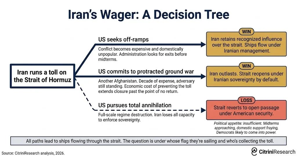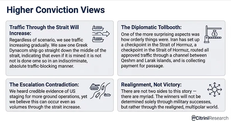 我们对海峡逐步重新开放的信心尽可能地高,只差确定性。这是此行每一次经历和对话所驱动的压倒性结论。结果范围缩减为:要么美国将伊朗打回石器时代,在这种情况下,他们失去了所有执行主权的能力,海峡在美国安全保障下恢复开放通行。要么冲突拖延,变得昂贵且不受欢迎,伊朗得到了它想要的某个版本——在伊朗管理下海峡重新开放。