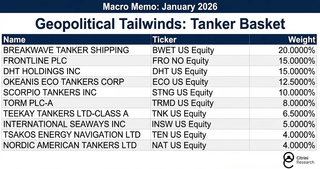 在我们一月份的宏观备忘录中,我们开始关注自福尔多行动以来持续上升的地缘政治紧张局势。我们做了与现在相同的事情——寻找不一定需要依赖特定冲突结果就能有上行空间的交易。我们确定了一篮子油轮和成品油轮,重点超配追踪油轮运费期货的 ETF——Breakwave Tanker Shipping(BWET US)。