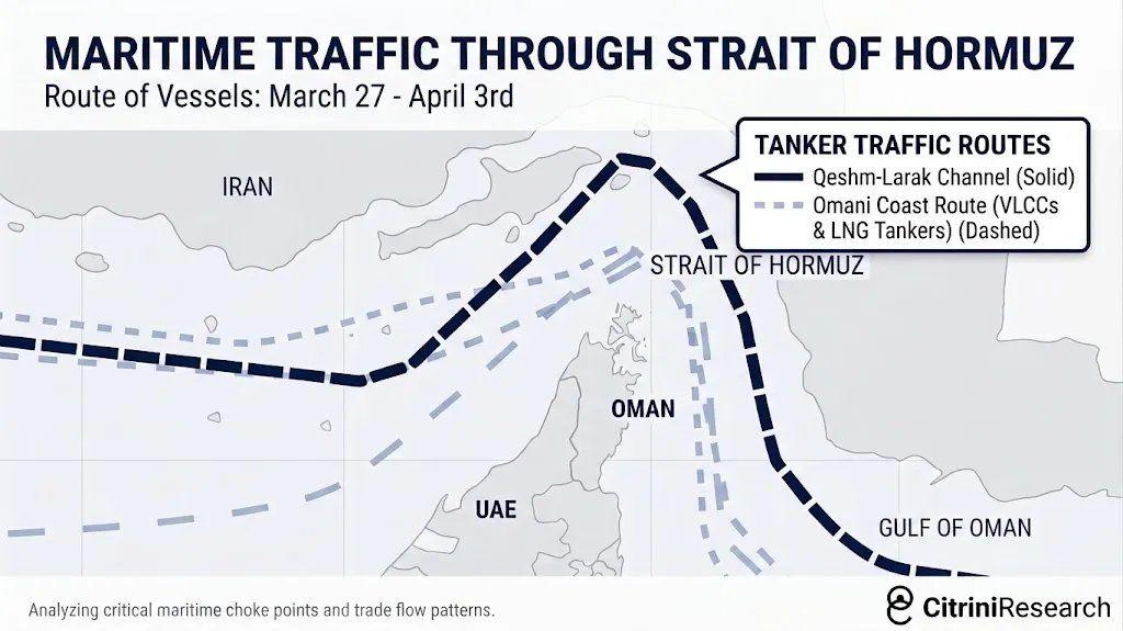 Citrini Research的实地调查显示,霍尔木兹海峡并未完全封锁,而是在伊朗主导下以"收费站"模式运行,冲突与商业过境并存。核心要点: