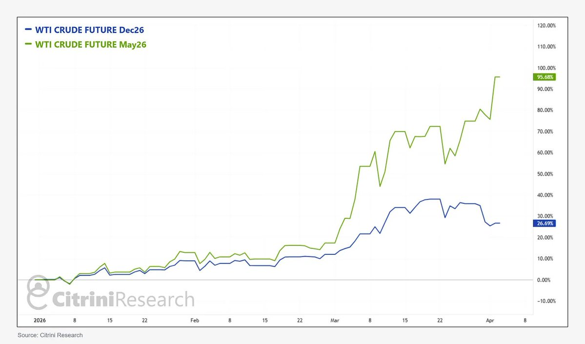 这应该能说明我们对冲突的看法是细致入微的——它不能简单地归入"海峡开放原油下跌"或"海峡关闭原油抛物线式上涨"。我们认为做多 2026 年 12 月 WTI 原油从这里开始效果不错,最终会寻找机会建立做多 CLZ6 对做空近月合约的头寸。我们必须提醒,鉴于与地面行动相关的非线性发展潜力(或者干脆等到头寸建立),我们会在近月做空腿上保持严格止损,这可能会在论点发挥作用之前以损害做空腿的方式推高近端。近月 110 美元、2026 年 12 月 71 美元,市场正在为短暂而剧烈的中断定价。
