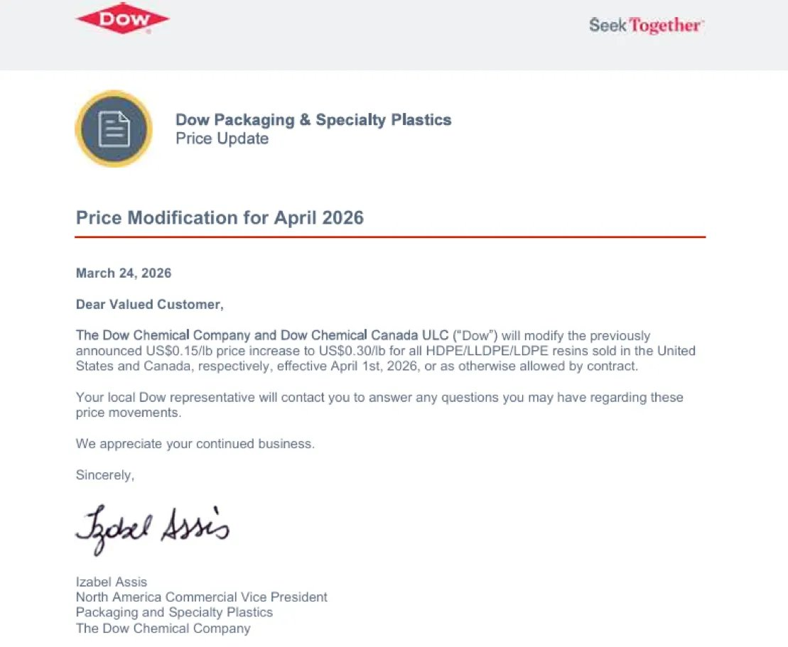 陶氏三月份 0.10 美元/磅的聚乙烯提价,已被四月份 0.30 美元/磅的提价所跟进(是此前宣布的 0.15 美元预期的两倍)。
