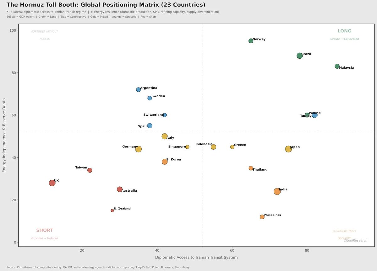 • 多挪威 / 空澳大利亚(净出口国无咽喉要道 vs. 无法自炼燃料)