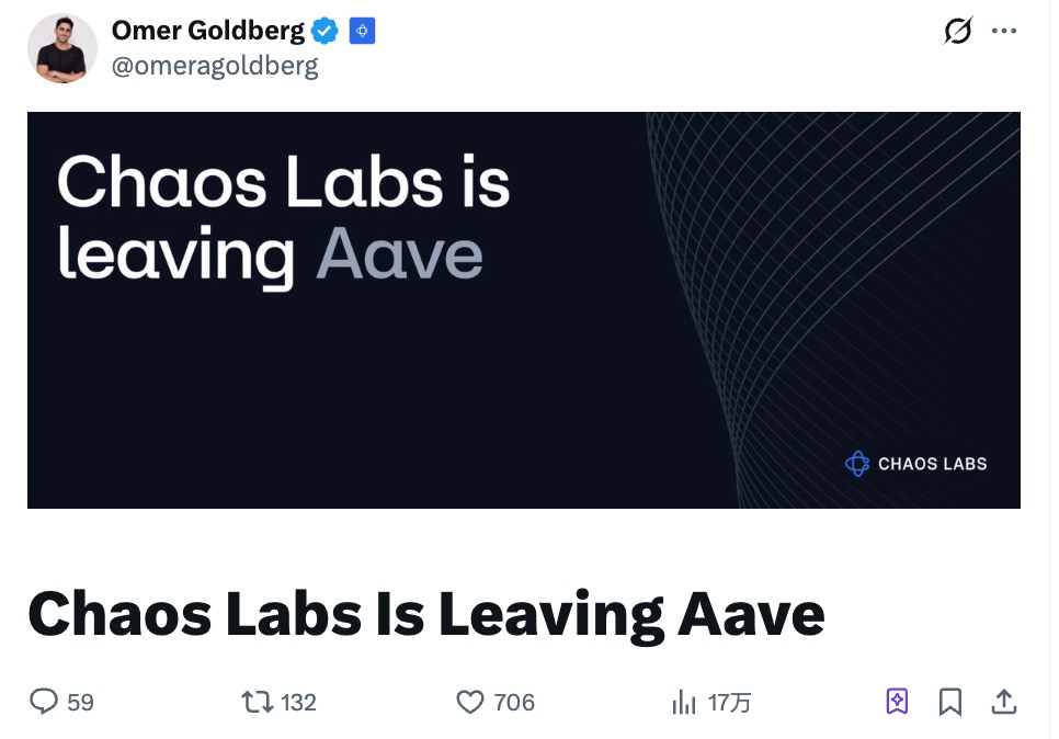 昨天,一家叫 Chaos Labs 的公司发了封告别信,宣布终止和 Aave 的合作。大多数用户可能没听过这个名字,但过去三年里,你在 Aave 上每一笔借贷的抵押率、清算线、风险参数,都是这家公司在定。