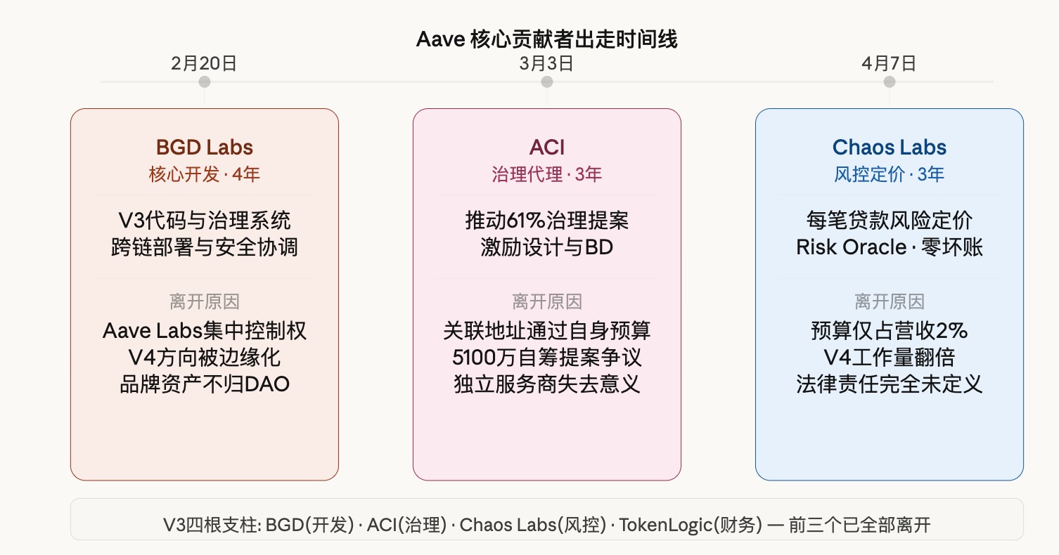 至此,V3 时代 Aave 靠四根支柱运转,开发、治理、风控、财务增长。现在前三根都走了。