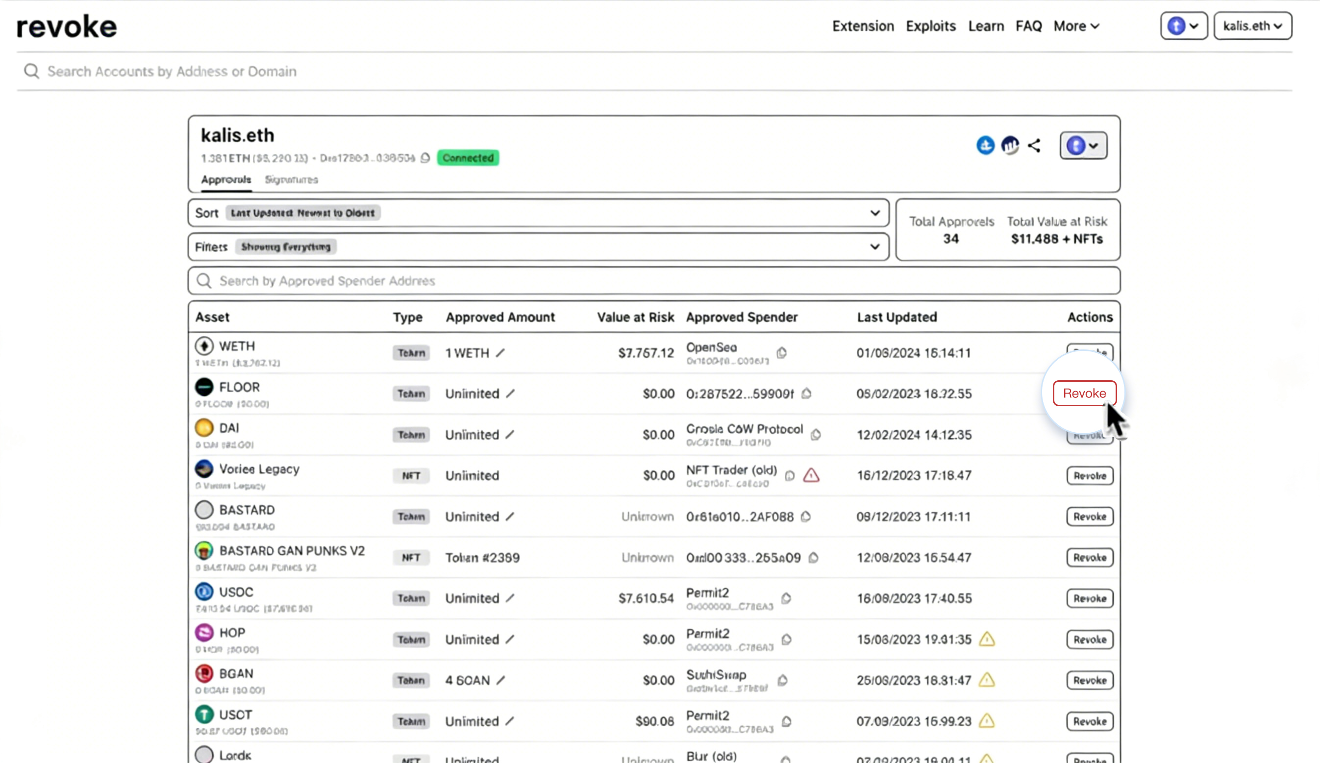revoke.cash 官网示例界面。圈中的“Unlimited”授权建议及时撤销。