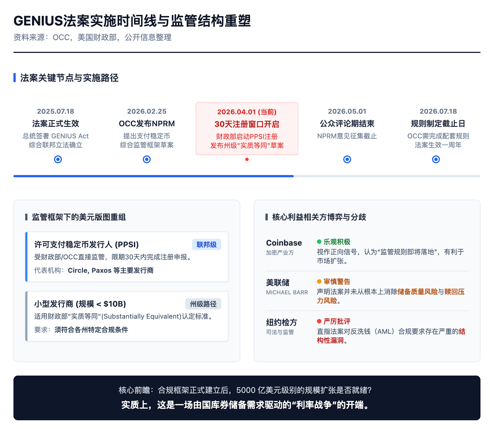 监管合法性窗口已开启,GENIUS 法案于 2026 年 4 月 1 日进入实施阶段,美国财政部与 OCC 联合启动 30 天注册窗口,Circle、Paxos 等主要发行商须在窗口期内提交"许可支付稳定币发行人(PPSI)"资格申请,合规稳定币进入正式监管轨道。