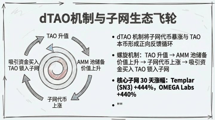 在 dTAO 机制下,子网代币的价格直接由质押在该子网池中的 TAO 储备量决定。TAO 本币升值带动所有子网的底层储备价值水涨船高。子网代币价格随之被动上涨。子网代币的暴涨吸引更多投机与质押资金买入 TAO 锁入子网。系统借此形成了强烈的正向反馈循环。