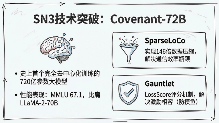 • 技术突破:SN3子网成功训练Covenant-72B大语言模型,720亿参数,性能对标LLaMA-2-70B,通过SparseLoCo算法解决通信瓶颈,获Anthropic联合创始人和英伟达CEO黄仁勋积极评价,证明去中心化训练可行性。