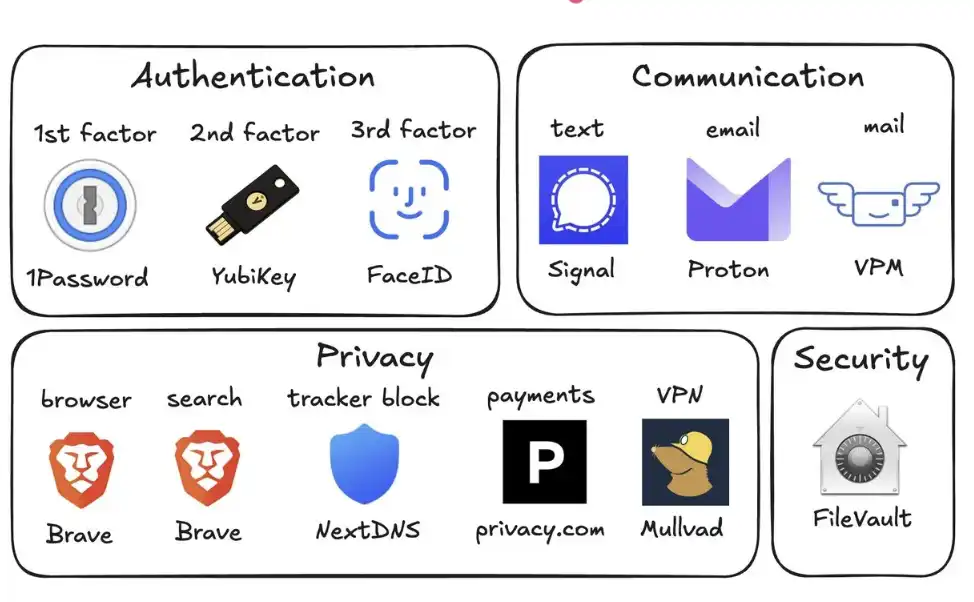 • 关键措施:使用密码管理器、硬件安全密钥、生物识别、磁盘加密、减少智能设备、使用Signal加密通信、隐私浏览器、Brave搜索引擎、虚拟信用卡、虚拟邮寄地址、避免点击邮件链接、选择性使用VPN、DNS广告拦截、网络监控工具。