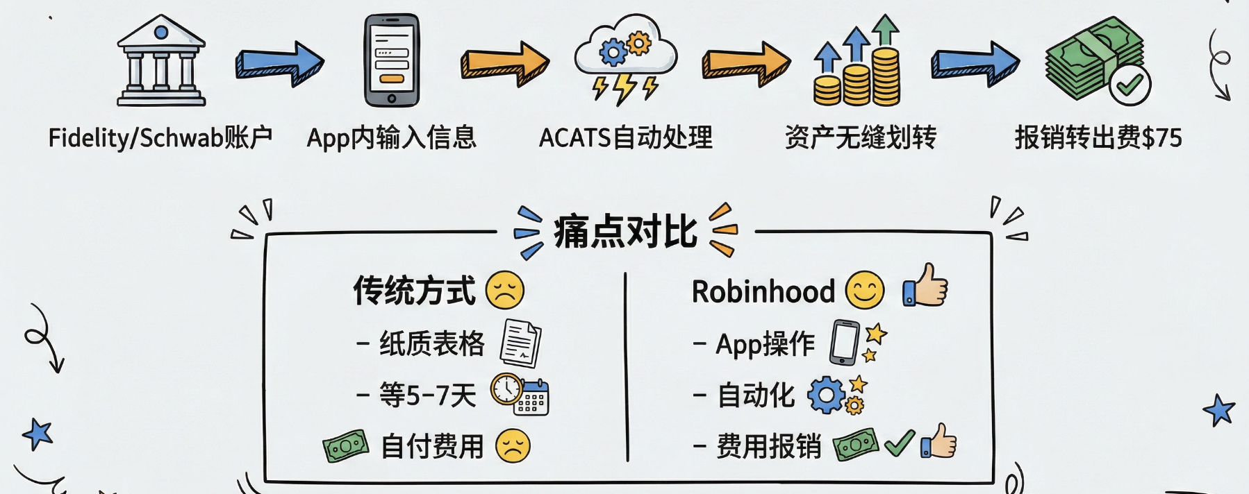 通过集成自动化客户账户转移服务(ACATS),Robinhood 实现了跨券商资产的无缝转移 。用户只需在 App 内输入原券商账户信息,甚至无需手动清算原有资产,Robinhood 的清算系统即可在后台自动完成资产的划转。对于部分券商收取的转出费用(通常为 75 美元),Robinhood 也会在符合条件的情况下予以报销。这种"一键搬家"的体验,彻底打破了传统机构依赖繁琐流程建立的资产转移壁垒。