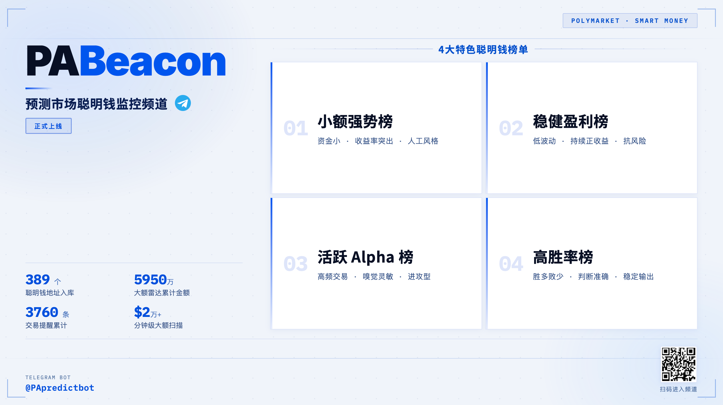 PA Beacon目前设有小额强势榜、稳健盈利榜、活跃Alpha榜和高胜率榜4张聪明钱榜单,聪明钱榜单每6小时轮动更新;同时运行两条分钟级监控线路,包括针对重点地址的Watchlist,以及覆盖全市场、单笔2万美元以上交易的“大额雷达”,覆盖体育、政治、地缘、电竞等全局赛道。