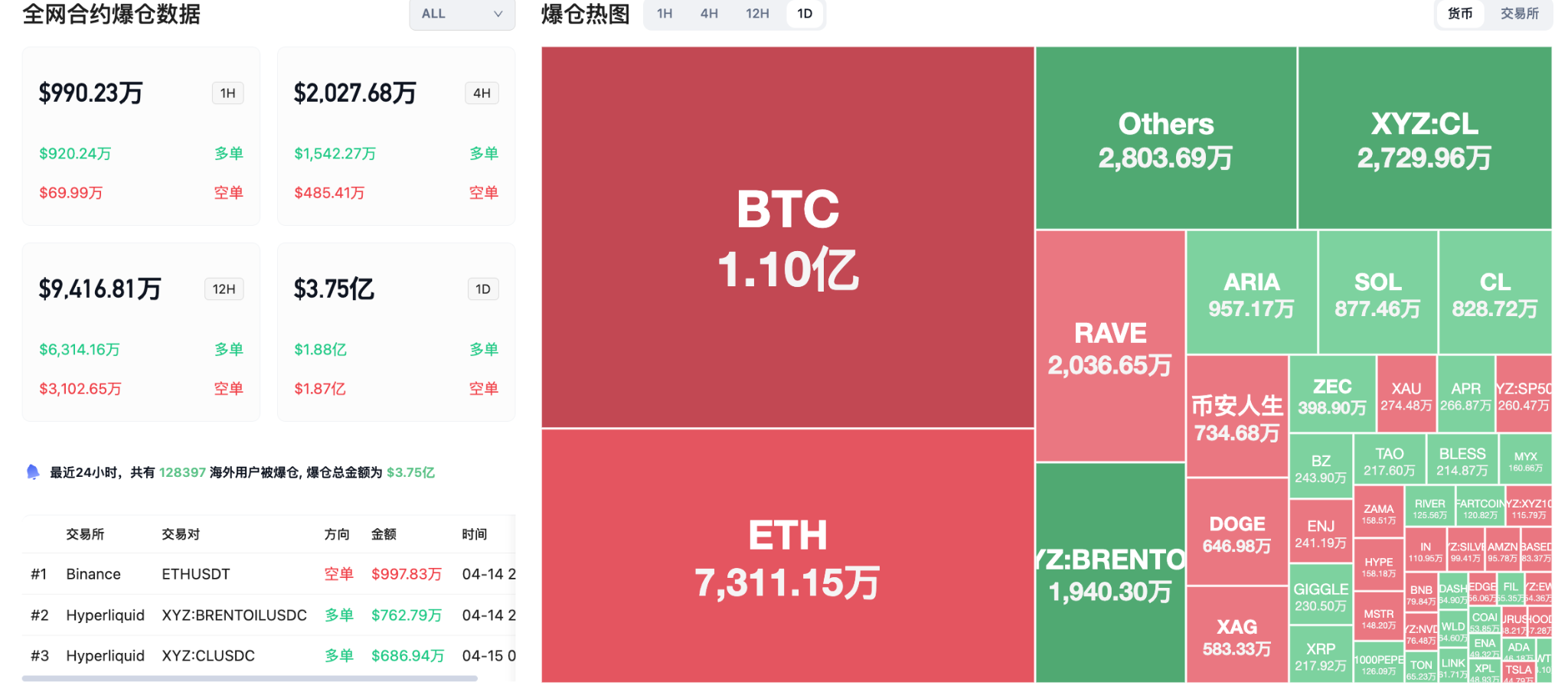 24小时爆仓数据:全球共128397人被爆仓,爆仓总金额为3.75亿美元,其中BTC爆仓1.1亿美元、ETH爆仓7311万美元、RAVE爆仓2036万美元。