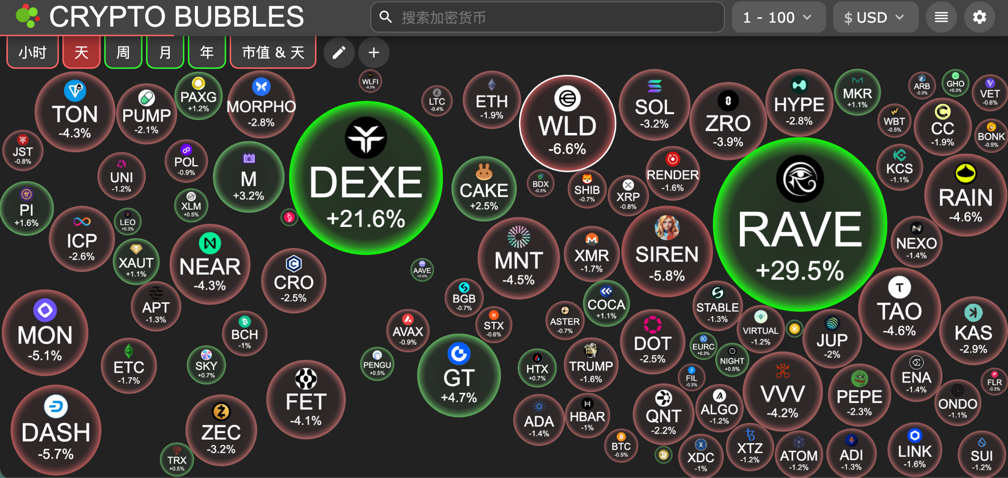 今日市值前100币种最大涨幅:RaveDAO涨 29.5%、DeXe涨 21.6%、Gate涨 4.7%、MemeCore涨 3.2%、PancakeSwap涨 2.5%。