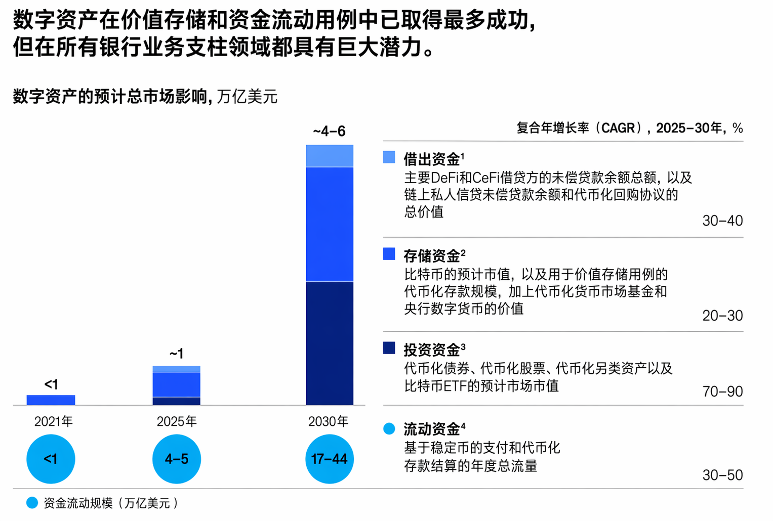 经过十年试验,数字资产已褪去投机外衣,成为传统金融机构可投资的基础设施。2020至2022年的非理性繁荣结束,市场焦点转向稳定币和代币化存款,它们正重塑资金转移、存储、贷款和投资,预计到2030年各领域将实现高两位数增长。
