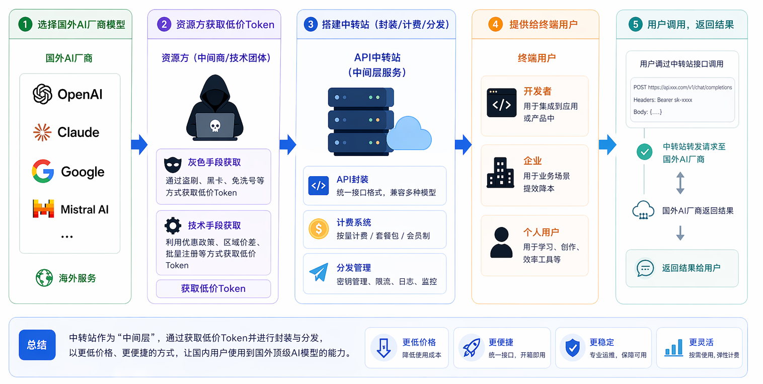那么,究竟什么是“API中转站”?它又是如何在全球AI价格差与访问壁垒中实现Token套利,并吸引大量个人和小团队入场的呢?