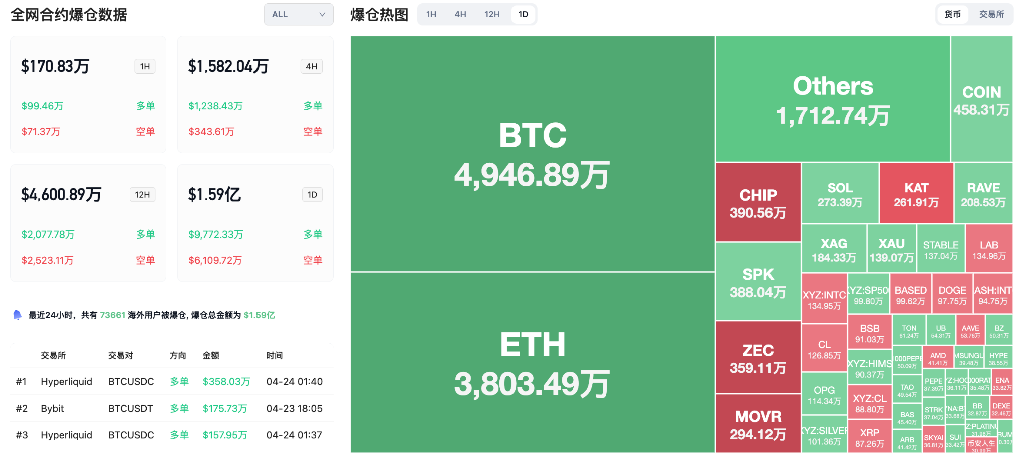 24小时爆仓数据:全球共92545人被爆仓,爆仓总金额为3.75亿美元,其中BTC爆仓1.76亿美元、ETH爆仓8449万美元、RAVE爆仓1247万美元。