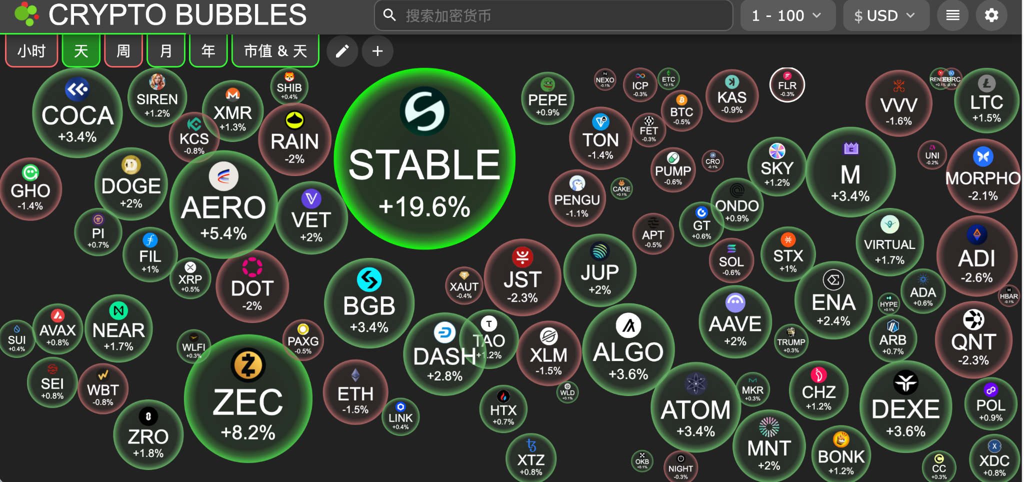 今日市值前100币种最大涨幅:Stable涨19.6%、Zcash涨8.2%、Aerodrome Finance涨5.4%、Algorand涨3.6%、DeXe涨3.6%。