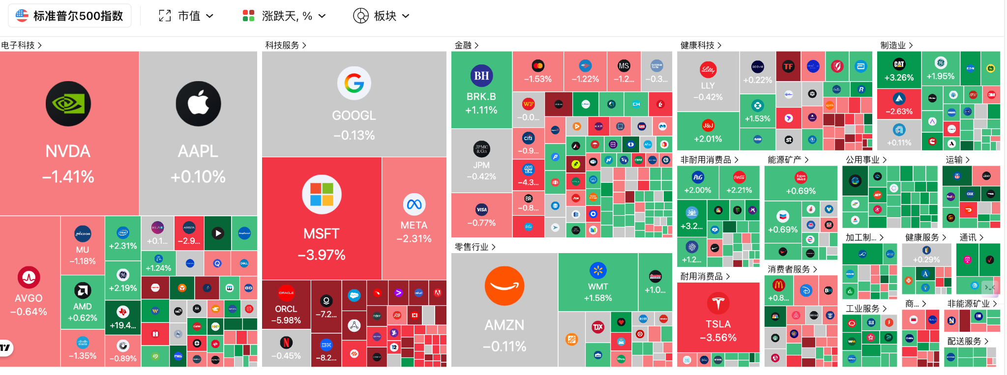 华尔街正被恐慌与贪婪反复拉扯,三大股指集体收跌。道琼斯工业指数下挫179.71点(-0.36%)至49,310.32点,标普500指数下跌29.50点(-0.41%)至7,108.40点,纳斯达克指数则重挫219.06点(-0.89%)报24,438.50点。市场弥漫着对美股或已逼近“泡沫顶部”的担忧情绪,投资者在FOMO情绪驱动下逐渐忽视风险。