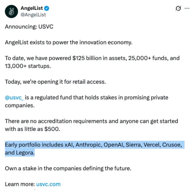 USVC 是一个 SEC 注册基金,最低 500 美元起投,无需 accredited investor 身份,早期组合包括 OpenAI、Anthropic、xAI、Sierra、Crusoe、Legora 和 Vercel 等公司。