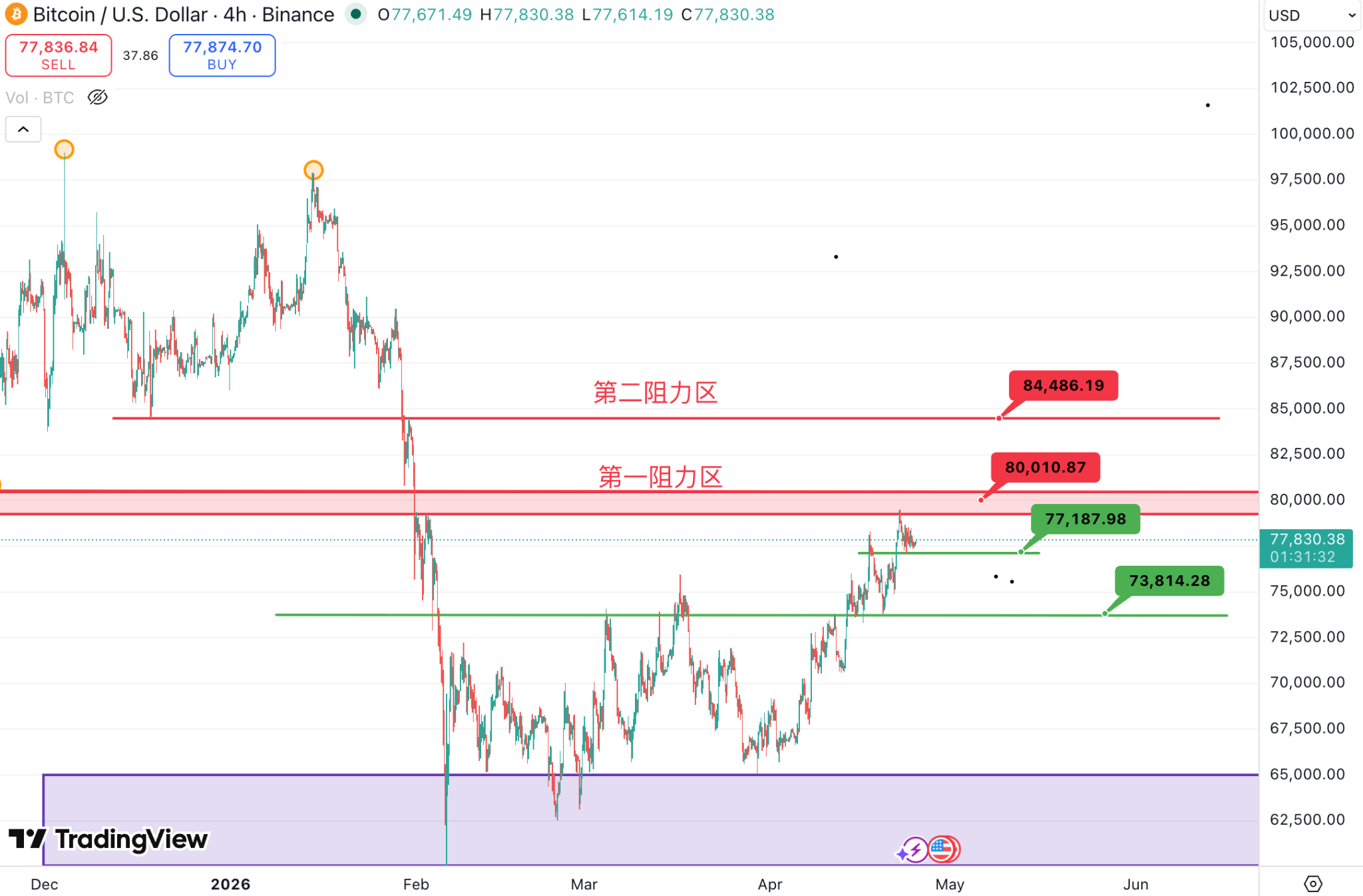 BTC进入关键区间:上方关注 78K—80K 压力区间,若放量突破则有望打开上行空间;下方关注 75K 支撑,跌破则可能回踩 72K—73K。ETH仍为跟随标的,若BTC回调,其下行弹性更大。整体判断:市场临近方向选择节点,短期波动率可能提升,需警惕突破或下破带来的趋势放大。