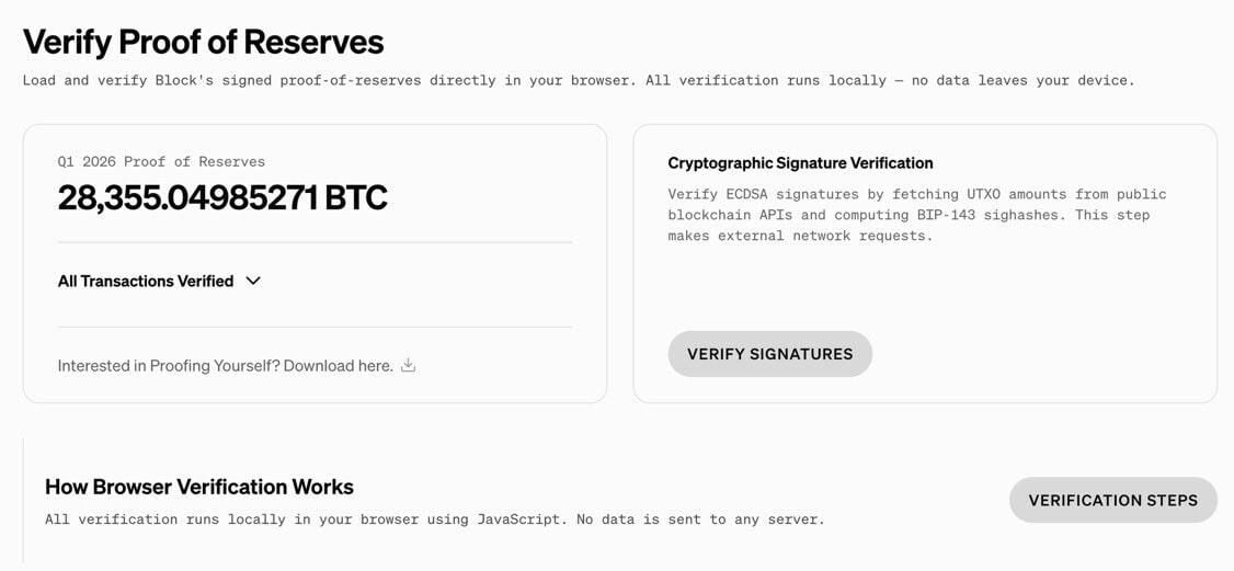 PANews 4月28日消息,据官网消息,Jack Dorsey旗下支付公司Block发布储备证明,截至2026年第一季度末,该公司总计持有28,355.05枚比特币,价值约22亿美元。其中客户持仓19,357.16枚(约15亿美元),公司资金库持仓8,997.89枚(约6.96亿美元)。