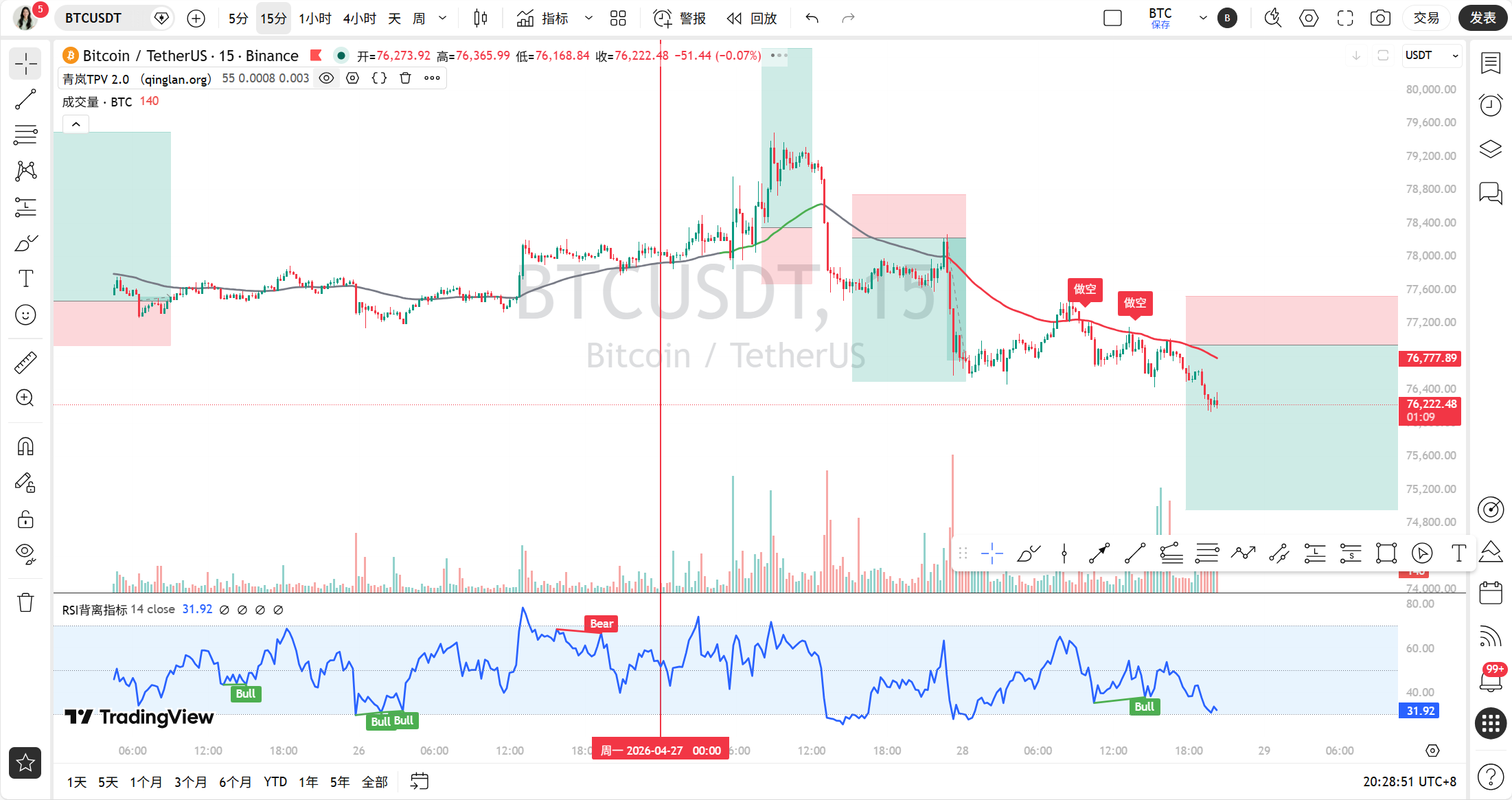 入场条件:如果BTC反弹至77000-77300区间(接近1小时EMA55),且出现滞涨信号(如K线收长上影线或成交量萎缩),可考虑轻仓做空。如果价格直接跌破75000,则不建议追空,因为下方支撑不明,风险较大。