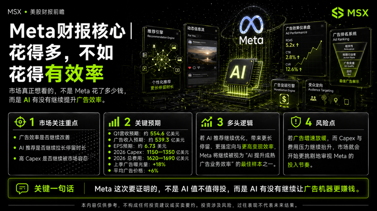 财报前市场主流预期大致是 Meta 一季度营收 554.6 亿美元、广告收入 539.3 亿美元、EPS 6.73 美元。这些数字当然重要,但真正决定市场情绪的,还是那条更底层的逻辑链:AI 推荐优化 → 用户停留增加 → 广告效率改善 → 广告收入提升 → 市场继续容忍高 Capex。如果这条链条继续成立,Meta 会继续被视为“AI 提高成熟业务效率”的最佳样本之一;反过来,如果广告增速放缓,而资本开支压力却越来越大,市场就会开始更挑剔地看待它的投入节奏。