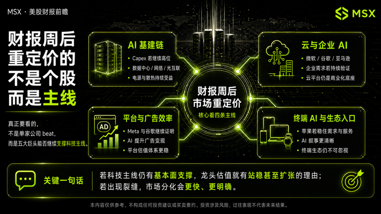 看似是五条不同的线,实际上都在指向同一个问题:当前科技龙头的高估值,到底是建立在真实兑现之上,还是仍然更多建立在预期之上。如果五家公司交出的答案大多偏正面,那么市场会更愿意继续推高 AI、云、广告平台和终端生态相关方向;但如果分化明显,市场就会从“普遍抬估值”回到“只奖励兑现最强者”的状态。
