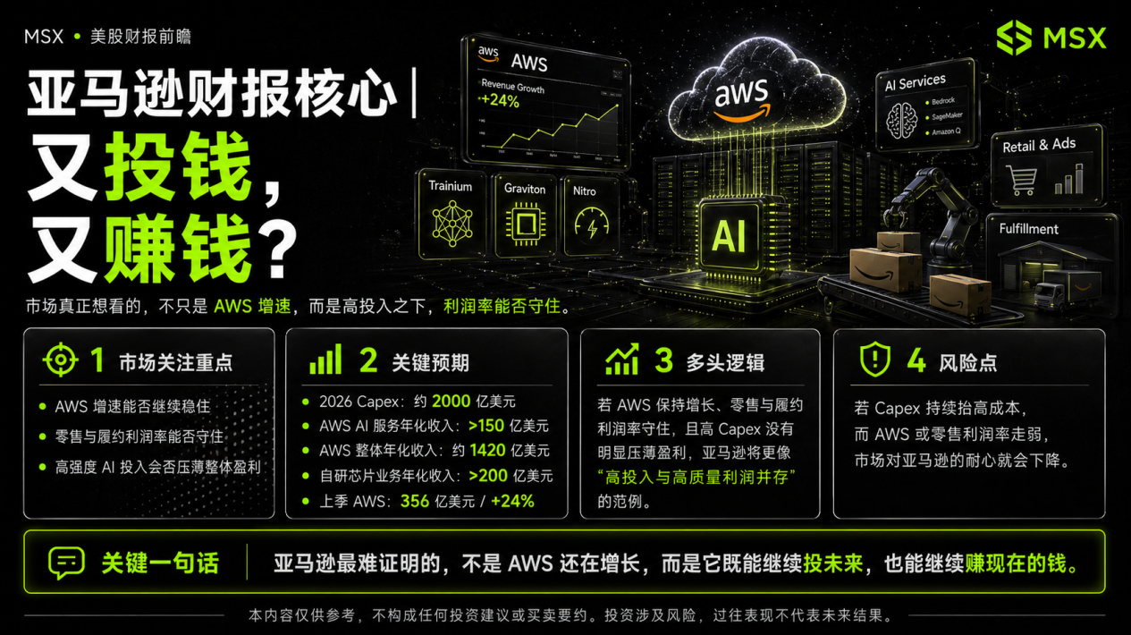 亚马逊这次财报的难点,和微软、谷歌都不一样。市场当然会看 AWS,但只看 AWS 其实还不够,因为亚马逊不是单一的云平台公司,它同时背着零售、电商、物流、广告和现金流这几条线。换句话说,市场看微软和谷歌,更多是在看 AI 和企业需求;看亚马逊,则是在看一家公司能不能一边继续押注未来,一边不牺牲当下的盈利质量。