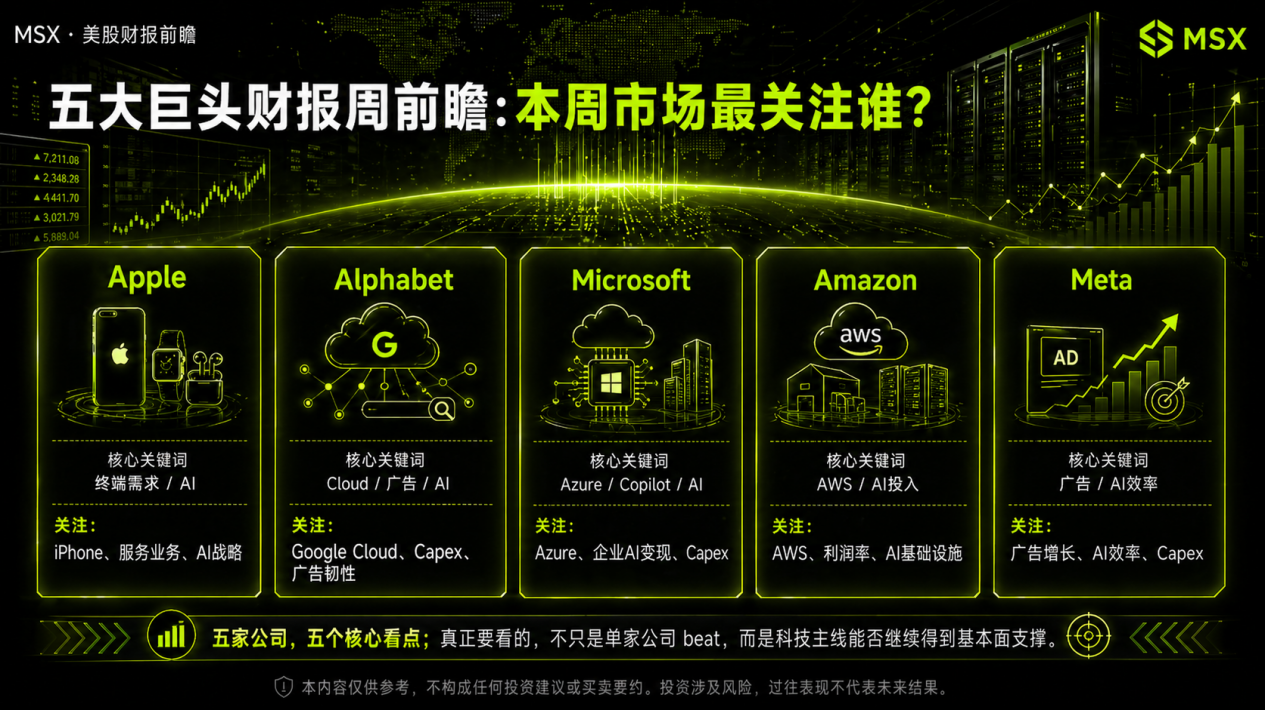 本周美股科技五巨头(微软、谷歌、亚马逊、Meta、苹果)将发布财报,市场核心关注AI投资能否持续带来收入增长和效率提升。微软验证AI商业化,谷歌需要将Cloud Next的故事兑现为数字,亚马逊面临高投入与利润平衡,Meta看AI提升广告效率,苹果则关注终端生态稳定性。财报周将决定市场对科技股估值重估的方向。