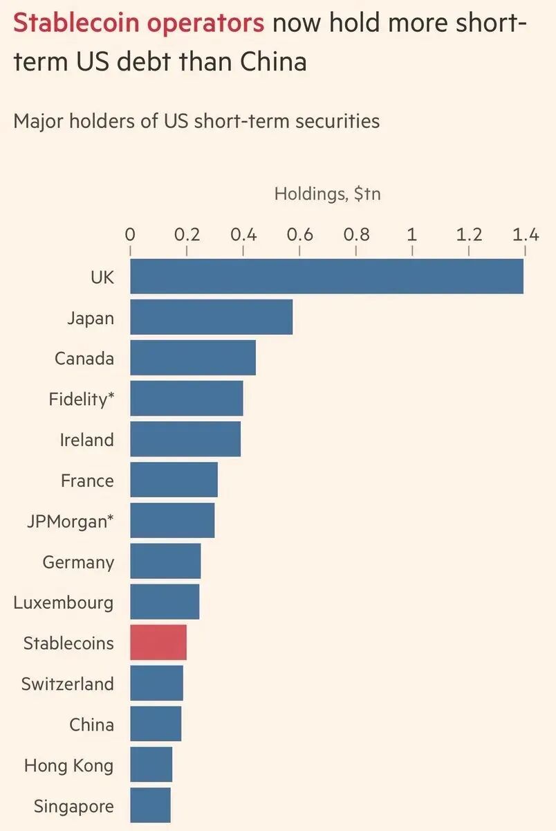 或许最关键的转变发生在财政部。珍妮特·耶伦曾将稳定币视为系统性风险。而斯科特·贝森特——一个坐拥官僚席位却长着对冲基金头脑的人——看清了它们的本质:美国国债唯一的净新增买家。