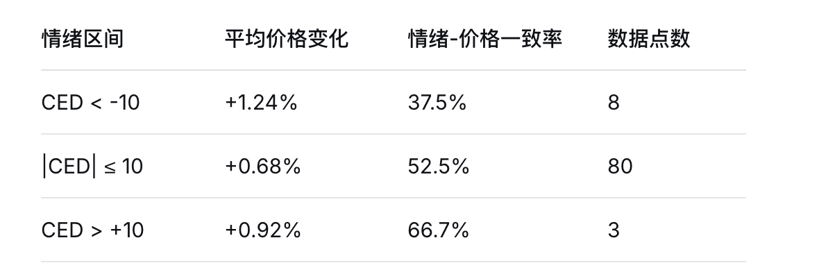 极端负向情绪阶段(CED < -10)反而伴随价格反弹,一致率仅37.5%,显示极端悲观情绪往往对应价格反转机会。情绪修复初期(CED > +10)价格表现最佳,一致率达到66.7%,中性情绪区间主导日内交易但价格方向性不明显。