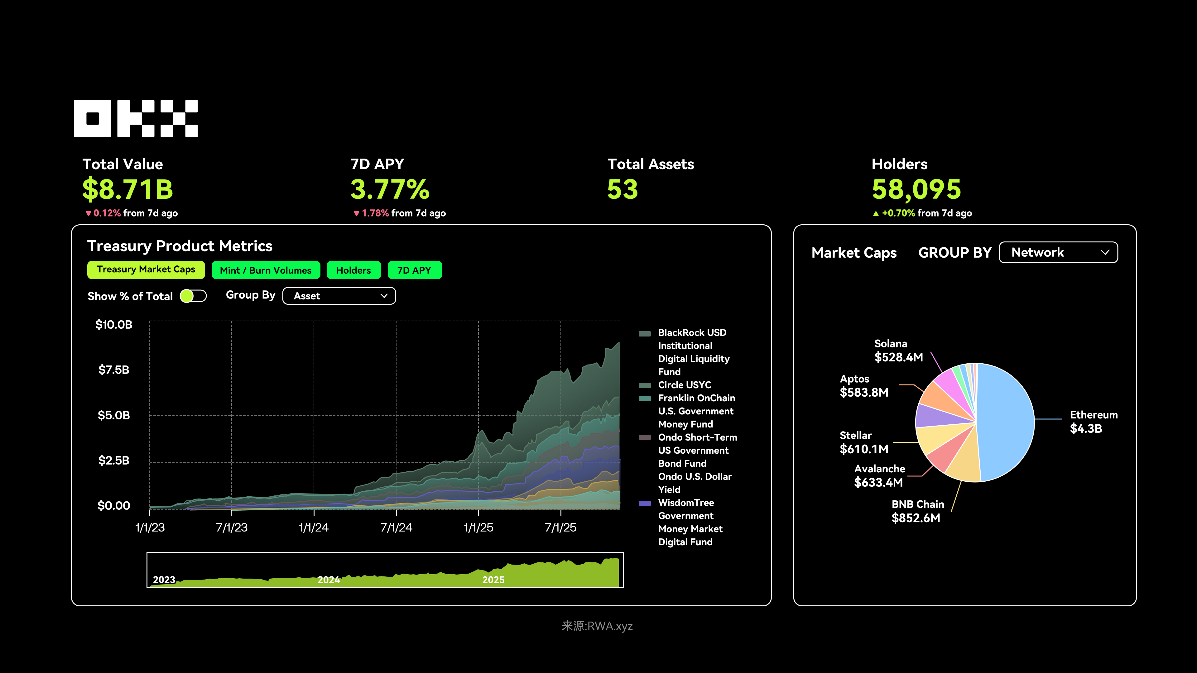 截至2025年11月7日,代币化美国国债市场总锁仓价值约为87亿美金,持有者超过5.8万人,7日平均年化收益率(APY)为3.77%,较前期略微下降,反映利率环境的变化。从链上分布看,Ethereum占比超过4.3B美金,同时多链趋势明显,如VanEck的VBILL基金扩展至多个生态。