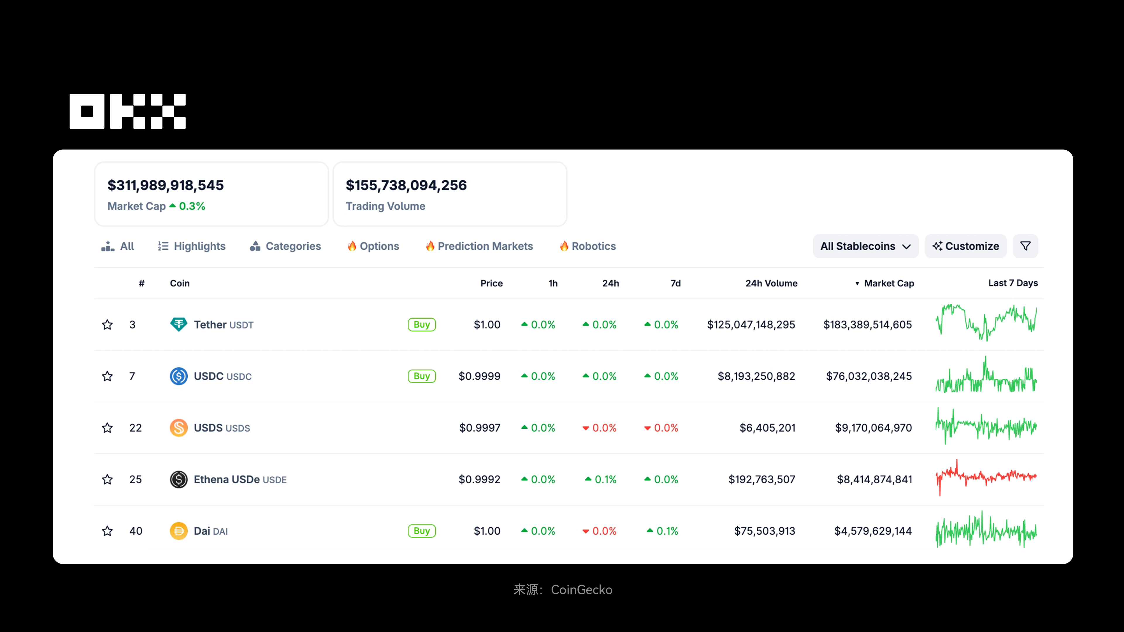 下表为全球主要稳定币概览(截至2025年11月11日)