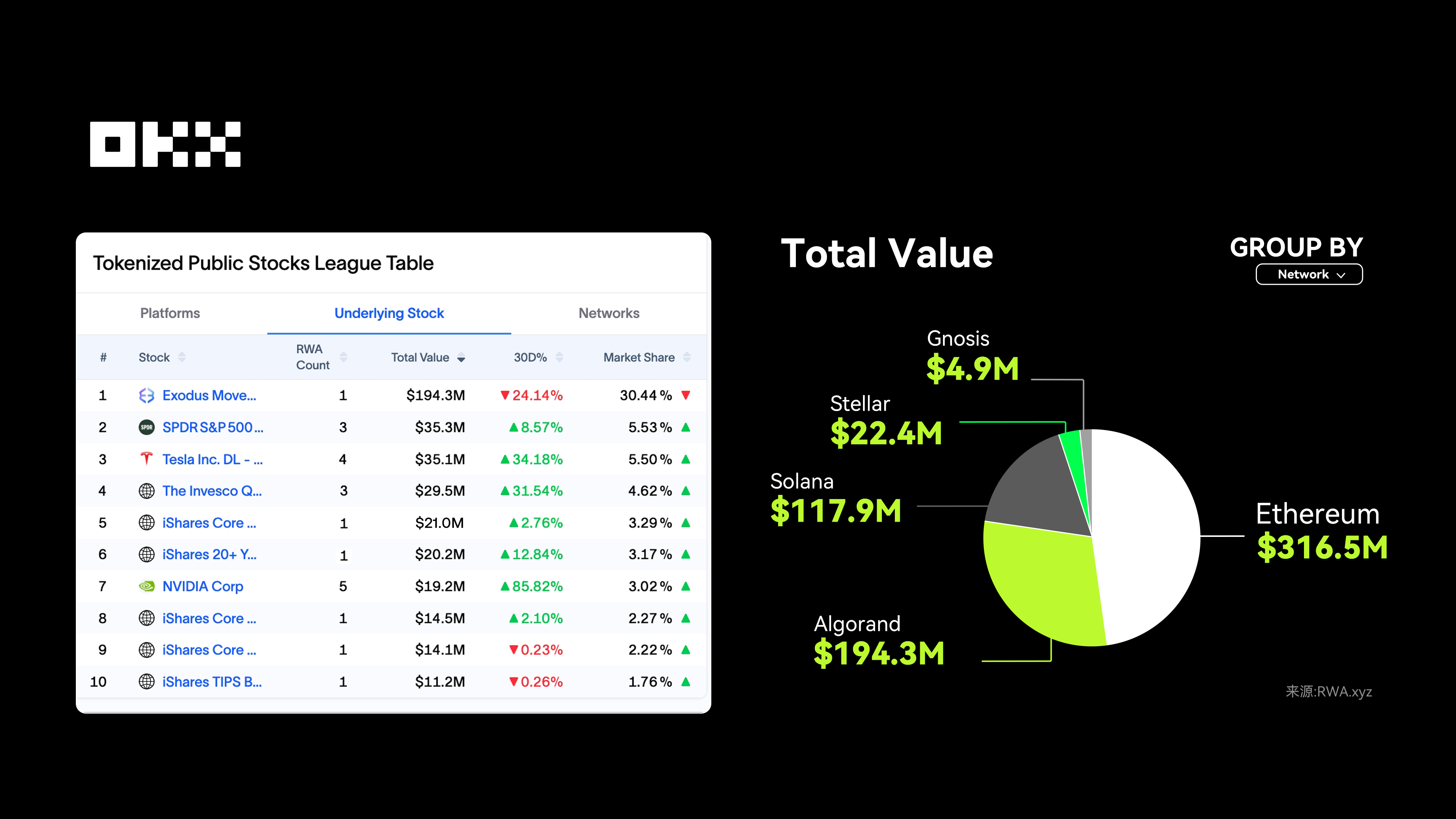 从资产结构上看,目前代币化股票的核心还是科技股和 ETF 产品,市场高度集中在几个头部项目里。比如,Exodus Movement Inc. (EXOD) 以 1.94 亿美元 的总价值稳居第一。2025 年 10 月 20 日,Exodus 宣布通过 Superstate 的发行平台,把普通股代币扩展到 Solana 上(此前主要运行在 Algorand 链),成为“原生链上股票”的代表案例,也说明合规型股权代币化正在从概念走向落地。