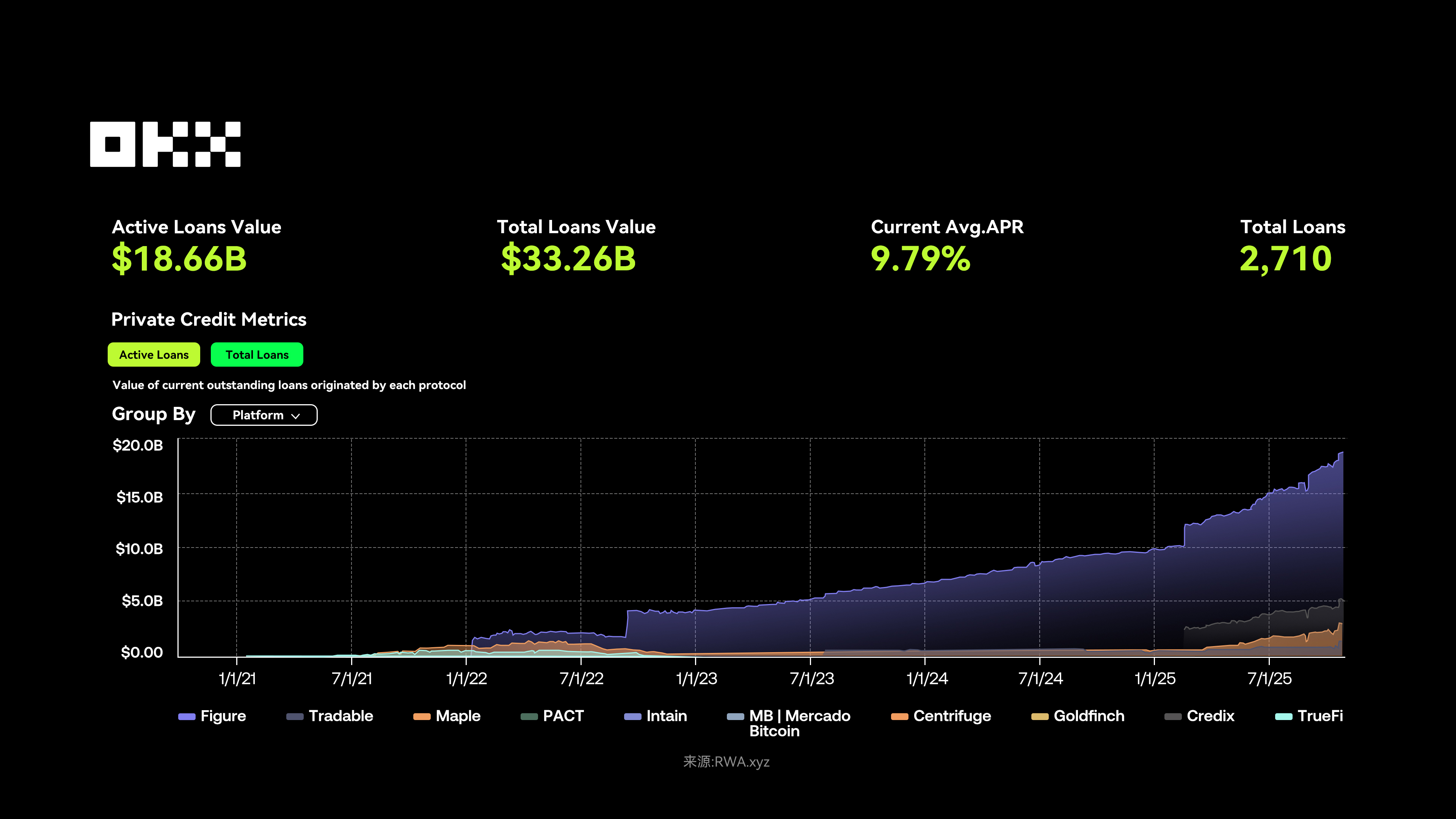 截至2025年11月7日,RWA领域私募信贷活跃贷款规模约186.6亿美元,平均年化利率9.79%,总贷款笔数2,710笔。Figure平台占据约92%市场份额,贷款总额达172亿美元;Centrifuge通过多链架构与DeFi协议互通,TVL从3.5亿美元增长至13亿美元以上,历史年化收益率8%-15%。