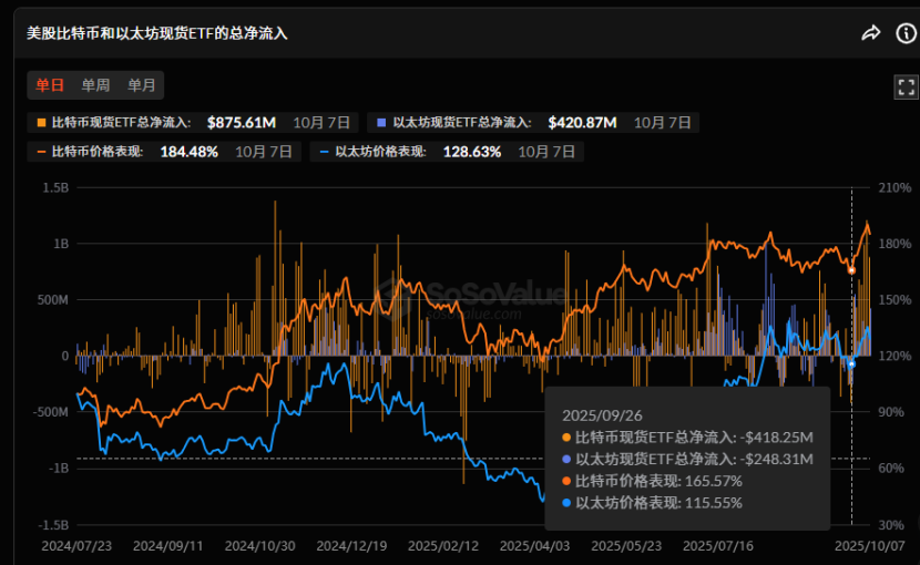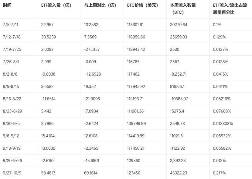 近期(9/27-10/9),比特币ETF资金出现了历史级别的强势流入。在近两周内,净流入高达53.48亿美元,相较于9月最后一周的轻微流出,实现了根本性逆转。与此同时,比特币价格强势走高并创下历史新高,表明本轮上涨主要由ETF巨额资金流入驱动。后市走势将紧密依赖ETF资金的持续性。