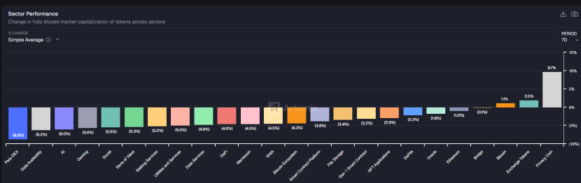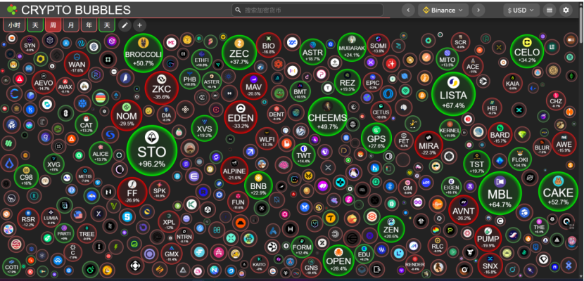 本周市场整体表现良好。涨幅居前的主要为币安生态代币,如CAKE、LISTA等表现抢眼,其他BSC链上代币也普遍上涨,大幅跑赢市场平均水平。此外,隐私币板块(如ZEC、ZEN)也出现明显上涨,市场情绪回暖,呈现热点轮动和高波动特征。