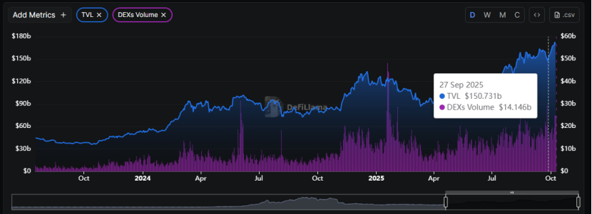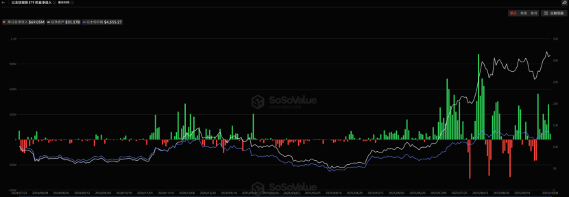 近期(9/27-10/9),以太坊ETF资金流入情况同样回暖,近两周净流入17.19亿美元。ETH价格也随之反弹,最高触及4700美元前高附近。然而,其资金流入强度相较于比特币稍逊一筹,这或许是ETH未能与BTC同步创下历史新高的原因之一。ETH能否突破前高,需看后续ETF资金是否持续加持。