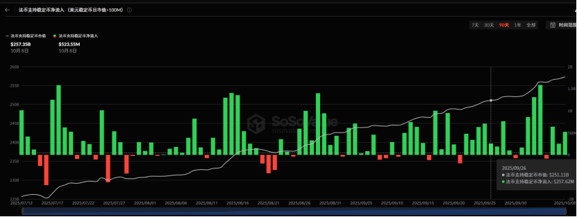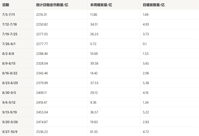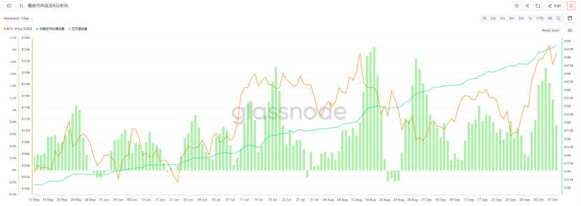 近期(9/27-10/9),稳定币总市值加速上升至2536.22亿美元。在近两周内,稳定币增发量高达61.35亿美元,日均增发4.72亿美元。相较于国庆前最后一周日均2.83亿美元的增发量,环比增幅达66.7%。持续高位的稳定币增发为市场提供了充足的流动性,与大盘的强势表现形成印证。后续行情能否延续,需密切关注稳定币的增发态势。