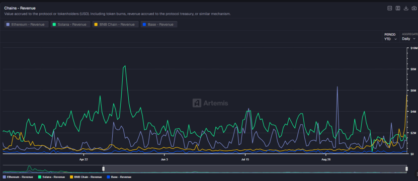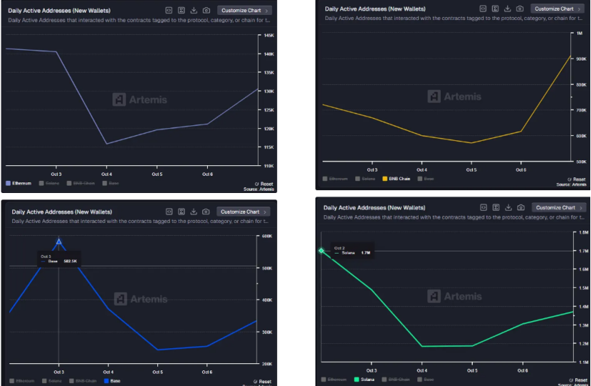 本周链上活跃度整体表现平平,唯独BSC链因受CZ(赵长鹏)、何一等因素影响,活跃度大幅增加,并涌现出多个大市值Memecoin,与新币上线形成共振效应(如币安人生、4、GIGGLE、BNBHOLDER等)。