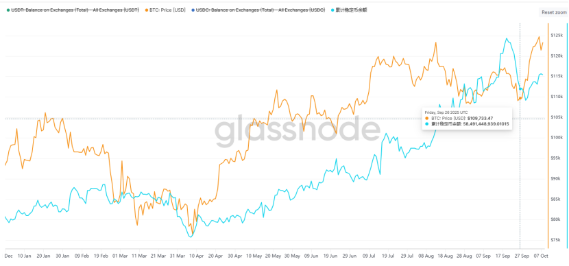 交易所的稳定币余额本周小幅流入。考虑到BTC已创下历史新高,该流入规模相对偏小,反映出追涨资金并不狂热。