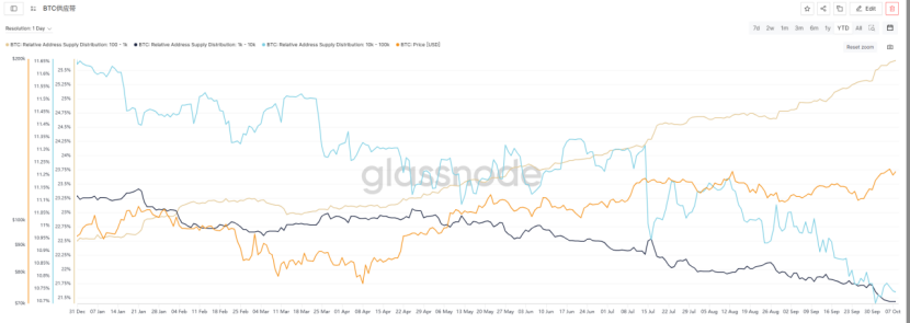 近期(9/27-10/9),持币量在100至1K BTC之间的地址占比持续上升,显示该群体处于持续吸筹状态。持币量在10K至100K BTC之间的大型地址占比也出现轻微拐头,有止跌企稳迹象,或开始吸筹。而持币量在1K至10K BTC之间的地址占比则延续下行趋势,表明这部分投资者仍在派发筹码。