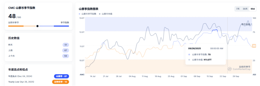 本周五山寨指数为48,较上周继续下降,表明主流山寨币相对于BTC的表现持续偏弱。