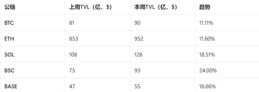 本周各公链TVL普遍大幅上涨,其中BSC链涨幅居前,表现突出。