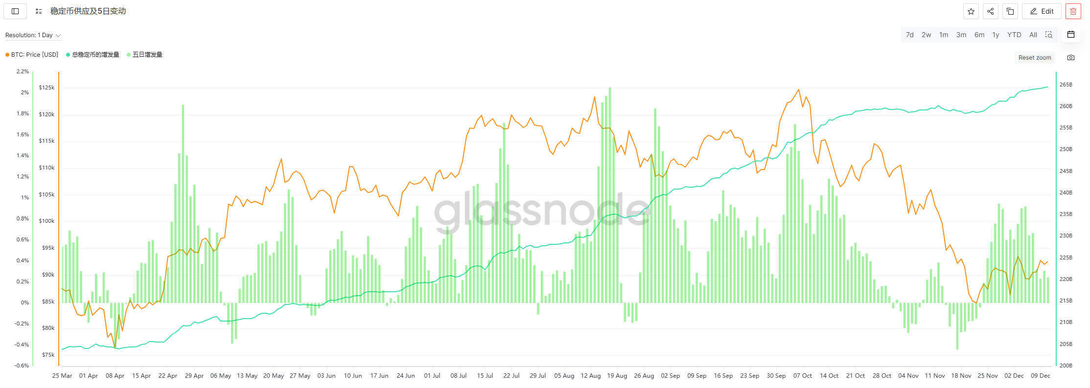 本周稳定币总量达 2644.57 亿美元,单周增发 8.6 亿美元,日均增发 1.23 亿美元,较上周的 30.26 亿美元和 4.32 亿美元环比下降 71.5%。增发降温与 BTC 高位震荡形成呼应,反映短期资金进场趋于谨慎,后续大盘能否突破阻力位,需关注下周稳定币增发是否回归 11 月底水平。