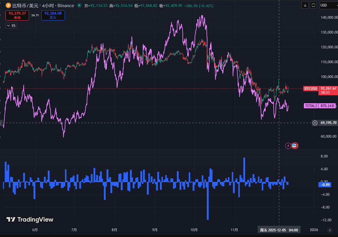 - 市值表现:TOTAL3(除 BTC、ETH 外全代币市值)报 8702 亿美元,环比下降 1.49%,跟随 BTC 窄幅波动。