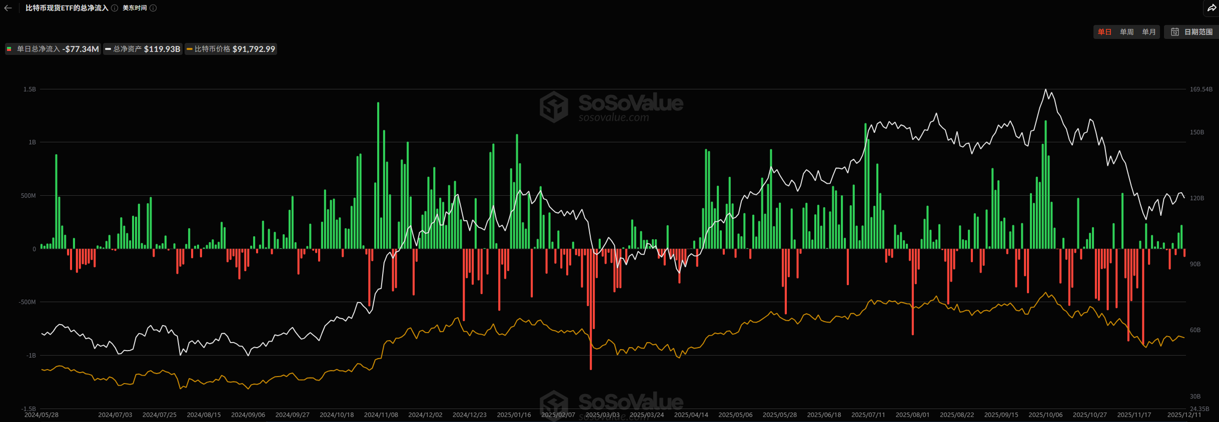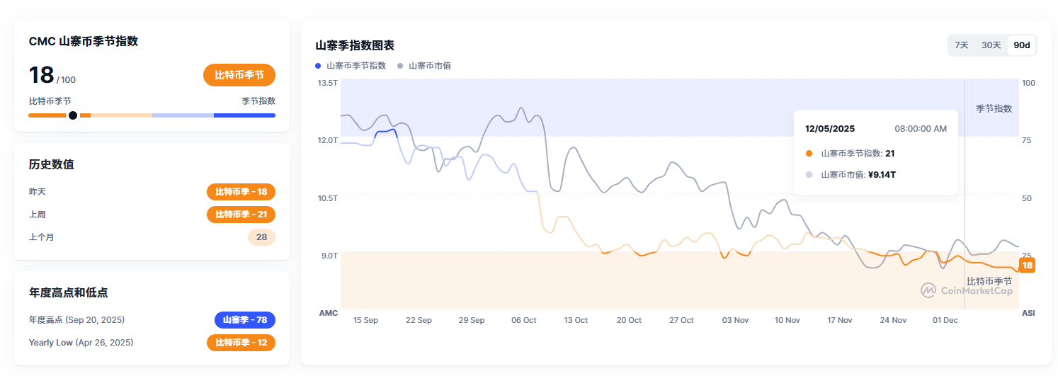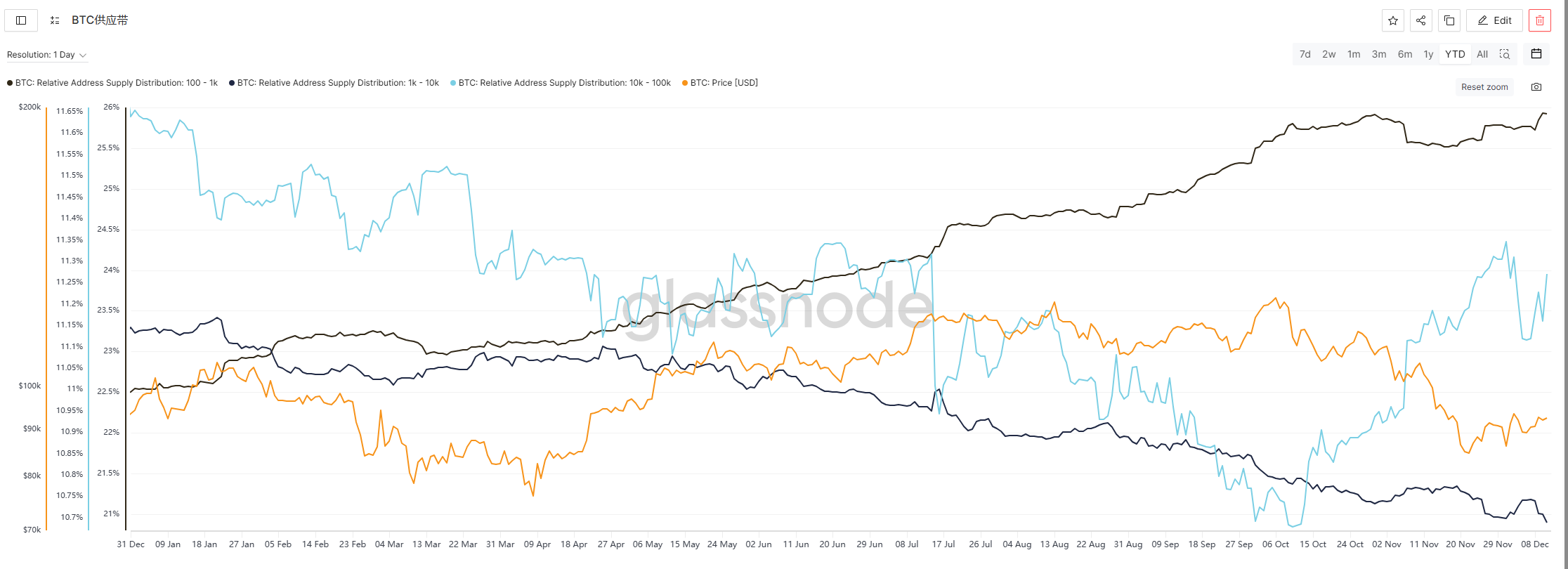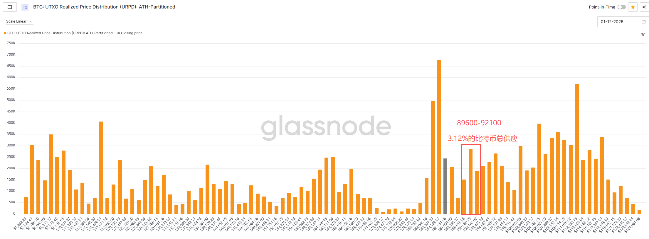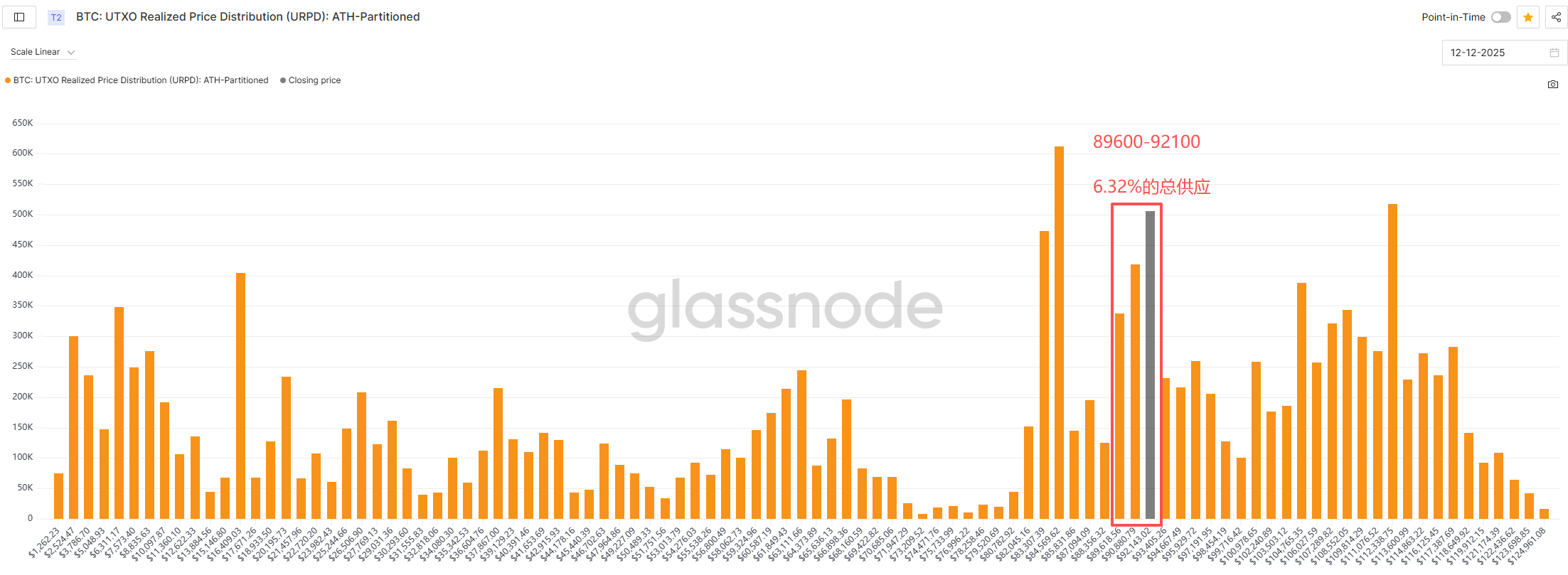- 筹码密集区:89600-92100 美元区间筹码占比达 BTC 总供应的 6.32%,较 12 月 1 日的 3.12% 增加 3.2%,多空换手激烈,行情方向选择临近。